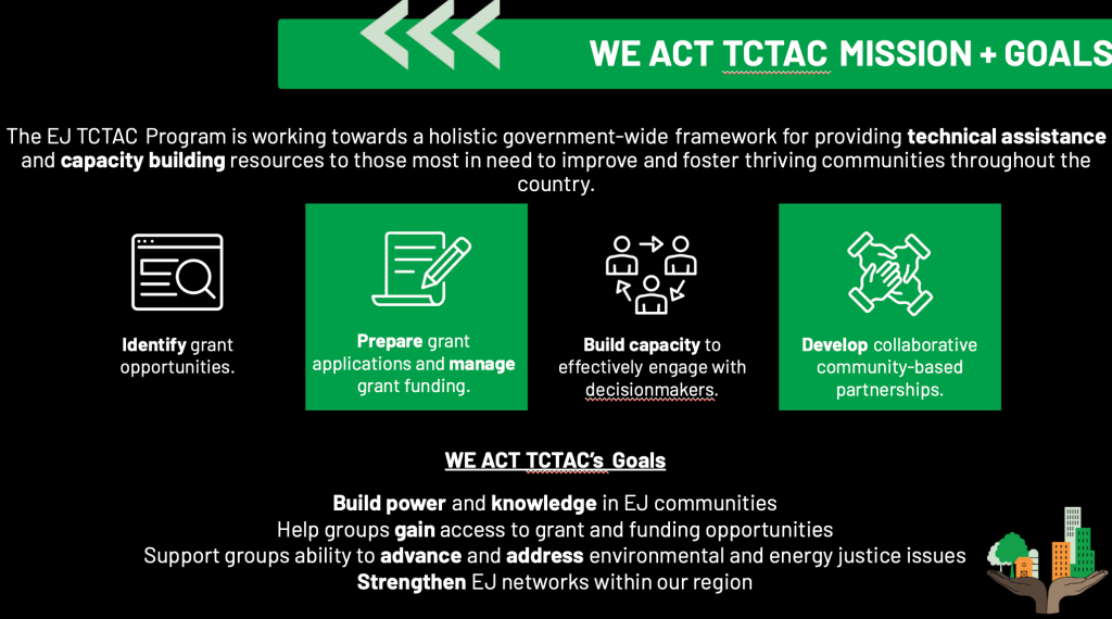 WASS and WE ACT will offer training and support with connecting communities to Technical Assistance (TA) to build capacity for navigating grant application systems, write strong grant proposals, manage grants, and engage in environmental and energy justice decision-making. By focusing on smaller regional organizations like WASS, the TCTAC program amplifies the voices of underserved people by engaging with them personally and directly to understand their needs and keep open communication, then connects them with the powerful support of the EPA.